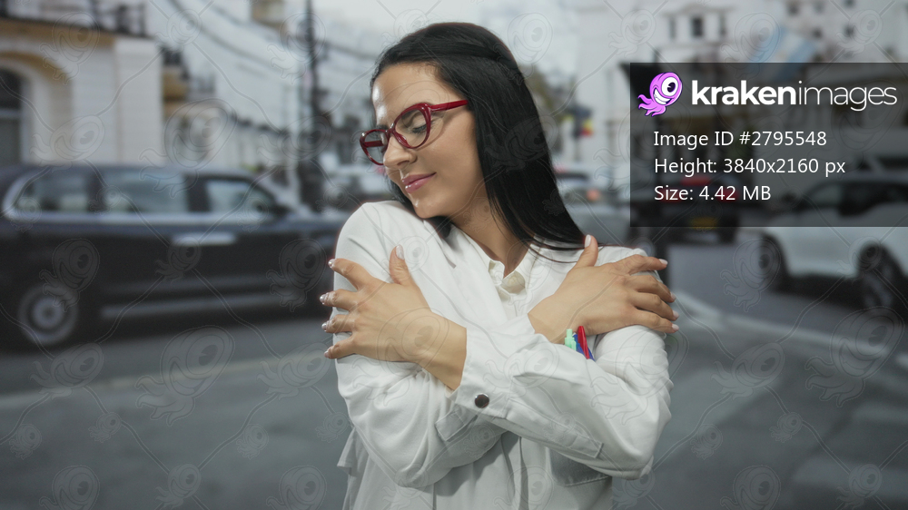Young hispanic woman in scientist uniform embraces herself on an outdoor street, exuding confidence and independence.