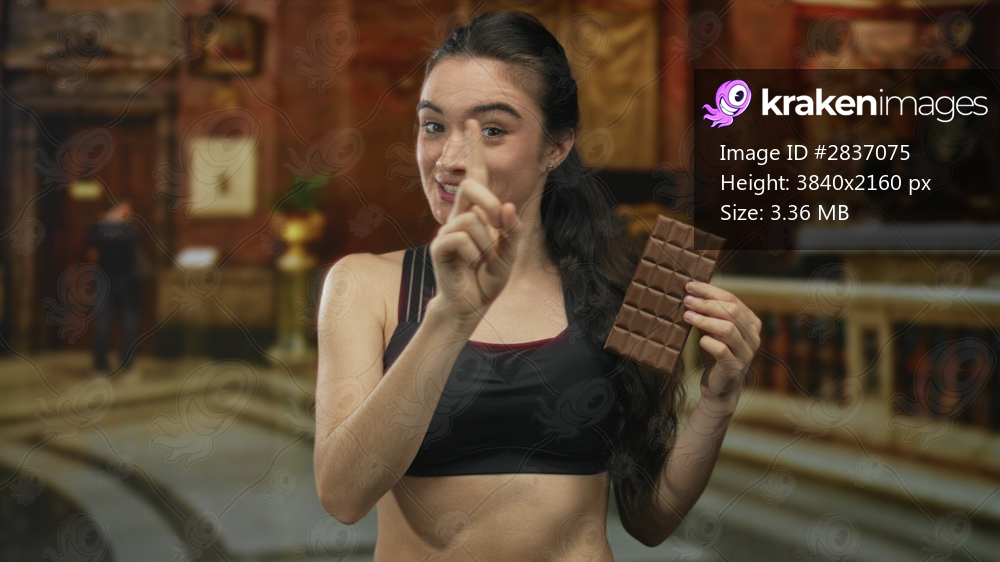 Young hispanic woman in sports bra flexes bicep and points finger to chocolate bar inside a building; joy confidence.
