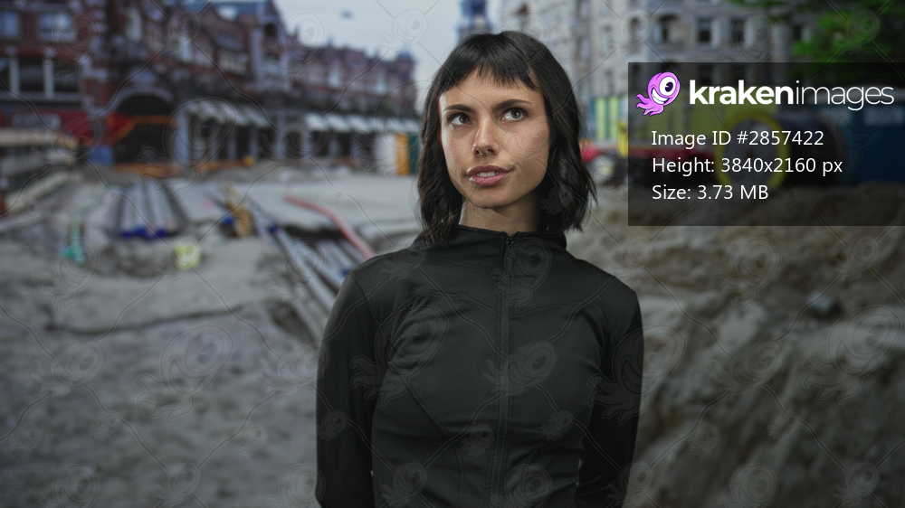 Young hispanic woman in sporty wear shows face while gazing upward in building under construction; hope determination.