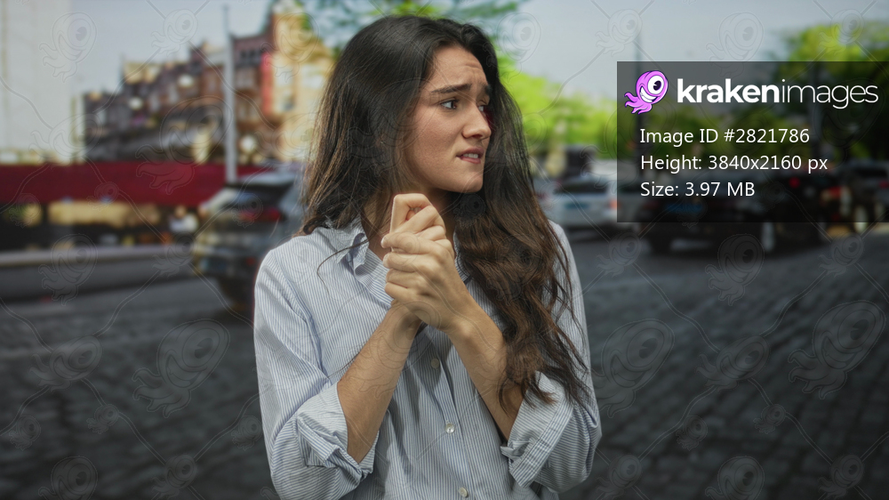 Young hispanic woman in striped shirt clasping hands to chest under sunlight on busy street among traffic; anxiety isolation vulnerability uncertainty. - Kraken Images
