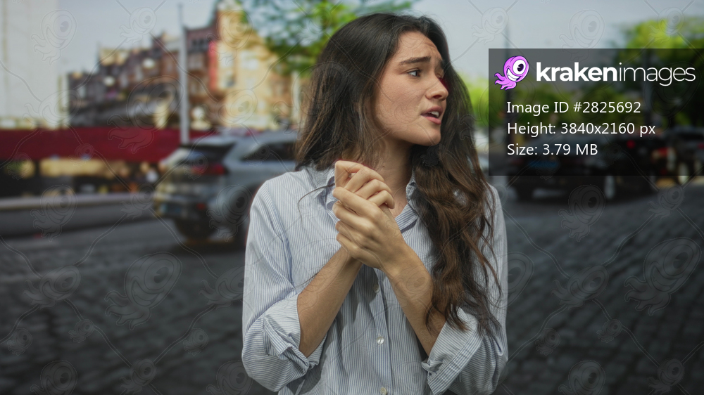 Young hispanic woman in striped shirt clasping hands to chest under sunlight on busy street among traffic; anxiety isolation vulnerability uncertainty. - Kraken Images