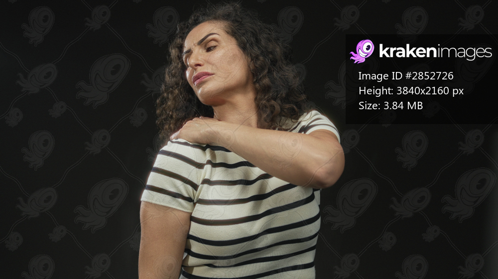 Young hispanic woman in striped shirt with curly hair holds shoulder in black studio; discomfort tension strain pain.