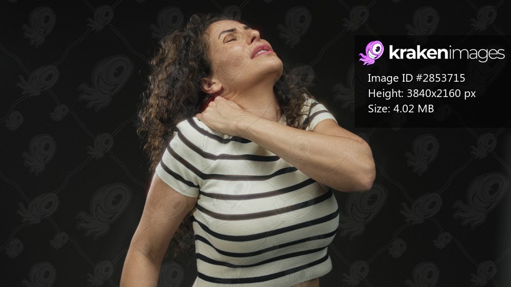 Young hispanic woman in striped shirt with curly hair holds shoulder in black studio; discomfort tension strain pain.
