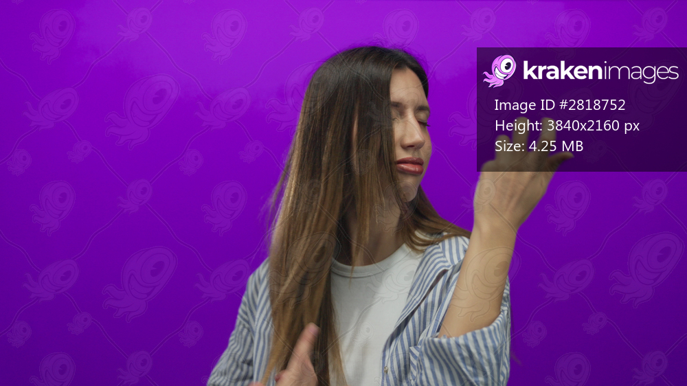 Young hispanic woman in striped shirt dancing with raised hand and flowing hair in studio; joy energy.