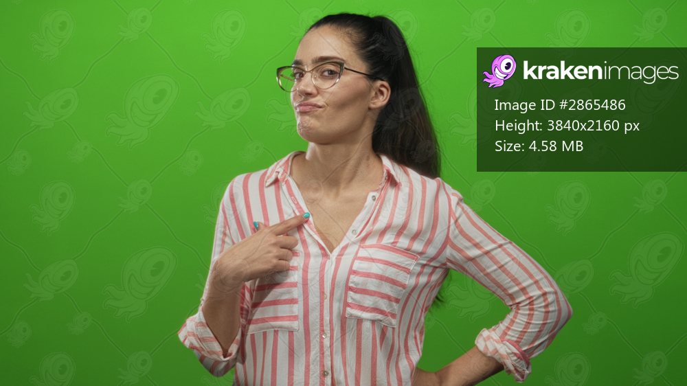 Young hispanic woman in striped shirt points index finger to chest in green studio wearing glasses; pride confidence self esteem.