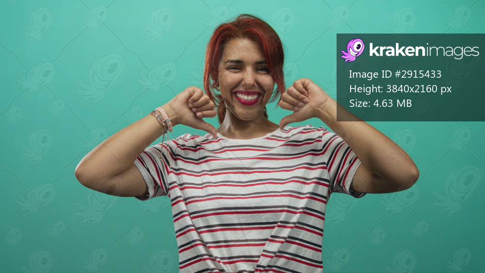 Young hispanic woman in striped shirt points thumbs to chest and smiles broadly in teal studio; confidence empowerment.