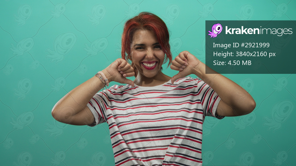 Young hispanic woman in striped shirt points thumbs to chest and smiles broadly in teal studio; confidence empowerment.