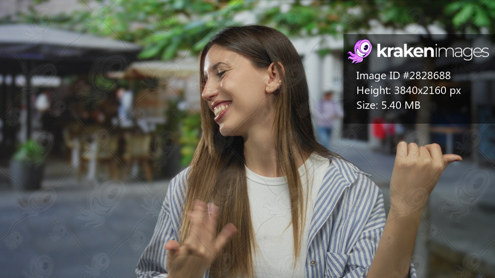 Young hispanic woman in striped shirt strums air guitar with hands on a bustling street; musical joy.