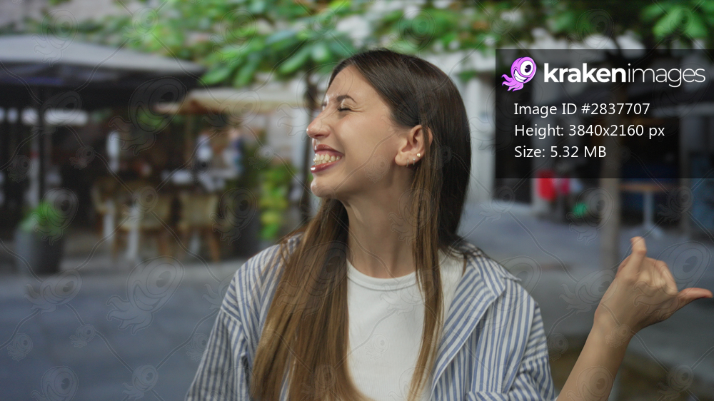 Young hispanic woman in striped shirt strums air guitar with hands on a bustling street; musical joy.