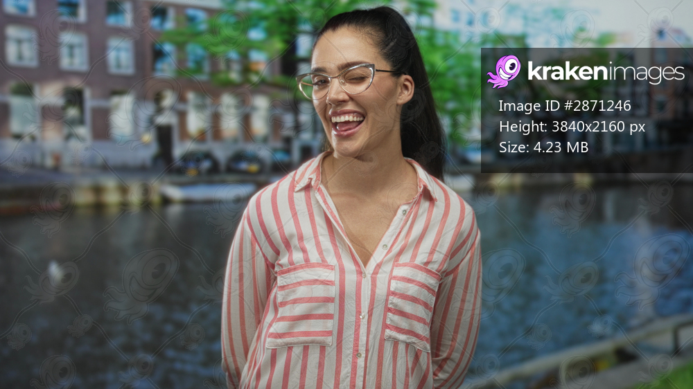 Young hispanic woman in striped shirt winks eye on amsterdam street by canal under soft sunlight; joy playfulness.