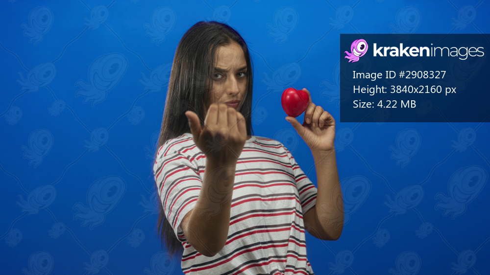 Young hispanic woman in striped tshirt pointing finger at camera while holding a red heart in blue studio; demanding love.