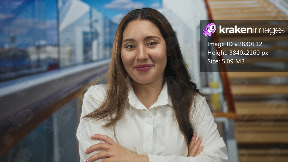 Young hispanic woman in white blouse crosses arms showing hands on cruise deck near wooden railing while smiling; quiet confidence.