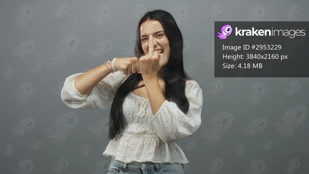 Young hispanic woman in white blouse shows middle finger to camera while making a playful punching motion in a gray studio setting; defiance playfulness. - Kraken Images
