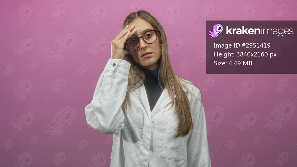 Young hispanic woman in white coat touching forehead with hand, eyes closed, wearing glasses in studio with pink backdrop; fatigue.