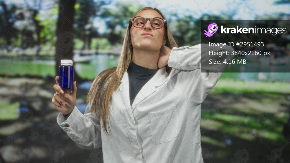 Young hispanic woman in white coat wearing glasses holding a blue medicine bottle and touching neck in studio; health concern.