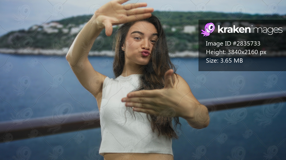 Young hispanic woman in white crop top holds her hands framing face beside railing on a street near the sea; joy.