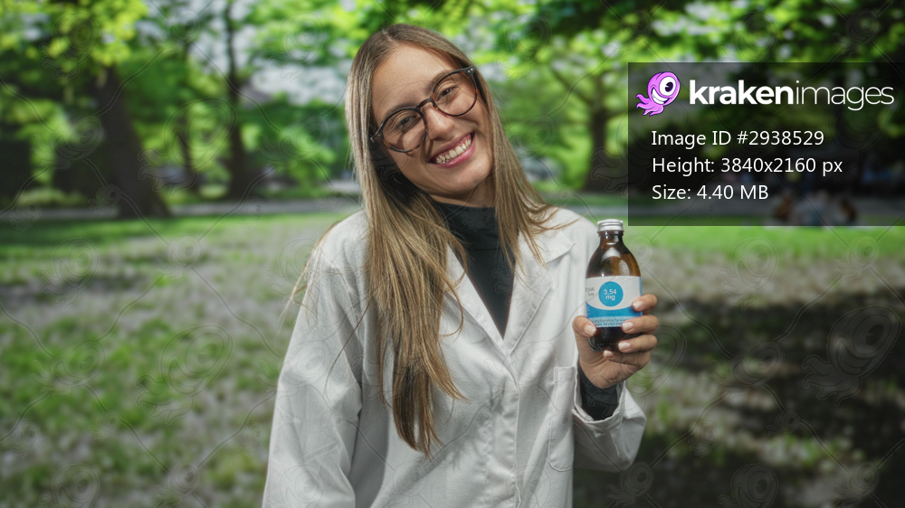 Young hispanic woman in white lab coat hugging a brown glass bottle and smiling in a forest; joy natural wellness.