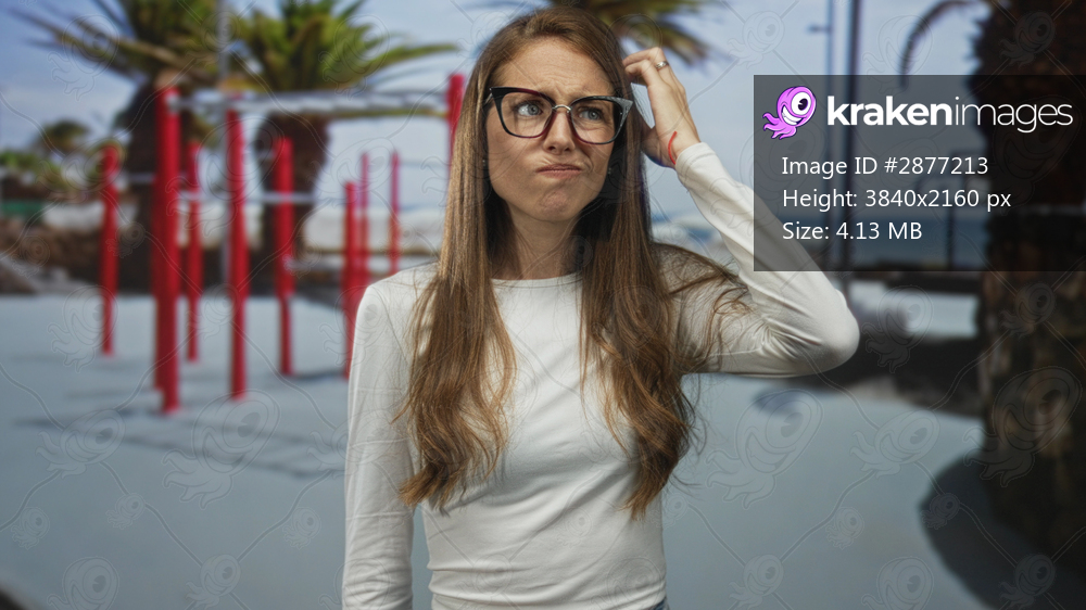 Young hispanic woman in white long sleeve top and glasses scratches head by red exercise bars on street; confusion.