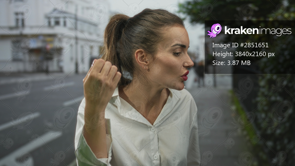 Young hispanic woman in white shirt beckoning with her hand on city street during daytime; confidence.