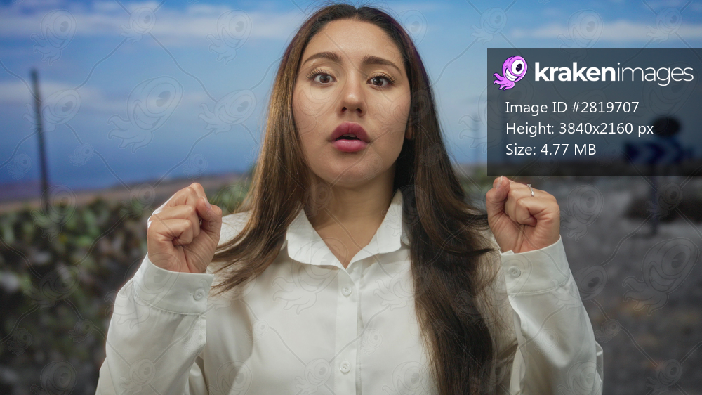 Young hispanic woman in white shirt clenches fists before windmill towers in field under blue sky; strength resilience perseverance determination.