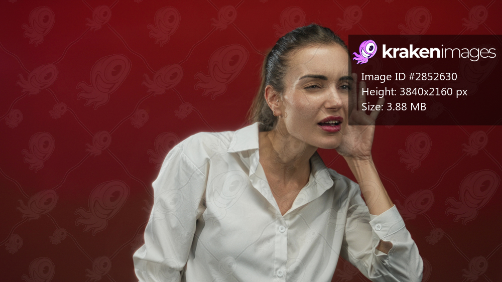Young hispanic woman in white shirt cups ear and peers aside on red studio set under bright light; curiosity.