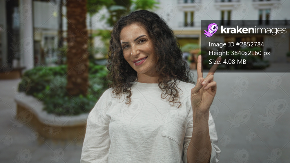 Young hispanic woman in white shirt with curly hair smiles and holds up peace sign in street; optimism.
