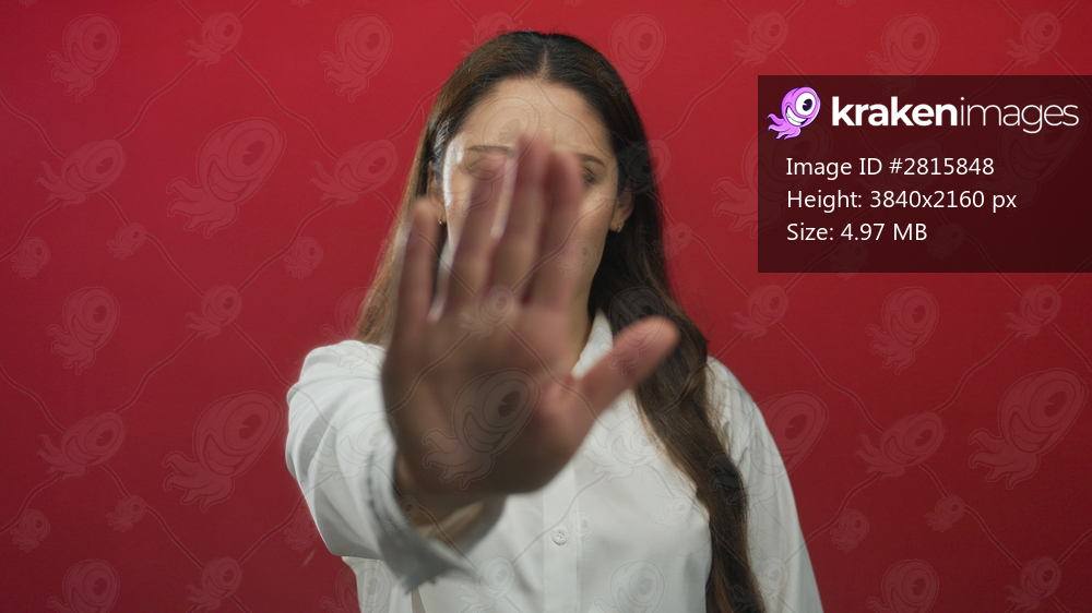 Young hispanic woman in white shirt with hand raised palm out in stop gesture in red studio; seriousness.