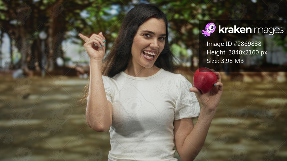 Young hispanic woman in white shirt holds red apple with finger pointing up and excited grin in green park; wellness.