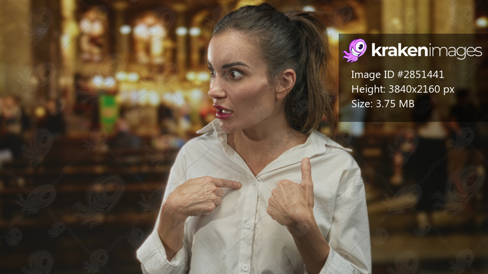 Young hispanic woman in white shirt pointing finger to chest inside historic church building with wooden pews; confusion.