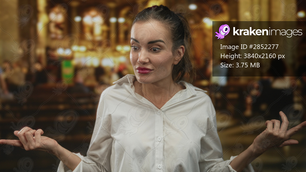 Young hispanic woman in white shirt pointing finger to chest inside historic church building with wooden pews; confusion.