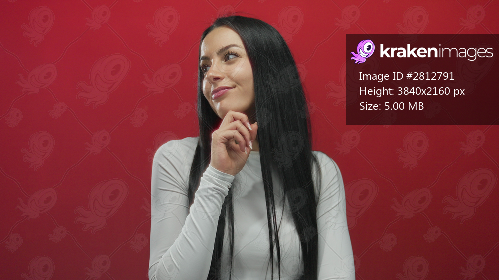 Young hispanic woman in white shirt posing against vibrant red wall isolated background with thoughtful expression showcasing modern style and personality - Kraken Images