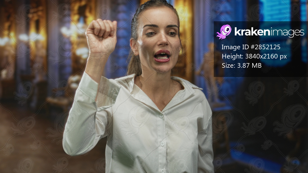 Young hispanic woman in white shirt raises fist in museum building; activism solidarity empowerment determination.