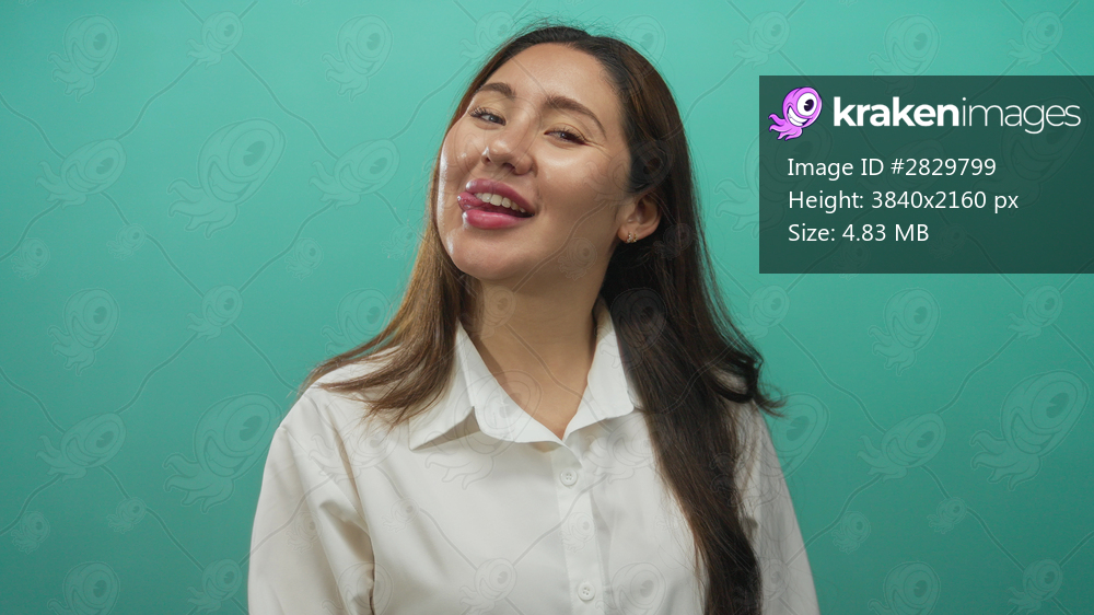 Young hispanic woman in white shirt sticks tongue out in studio against turquoise wall; playful fun.