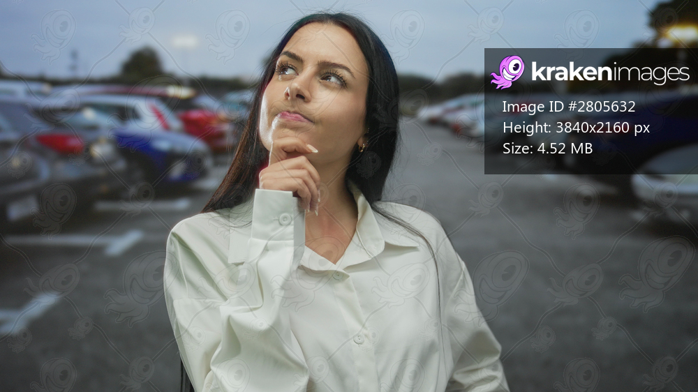 Young hispanic woman in white shirt thinking deeply in outdoor parking setting surrounded by cars, capturing an insightful and reflective moment.