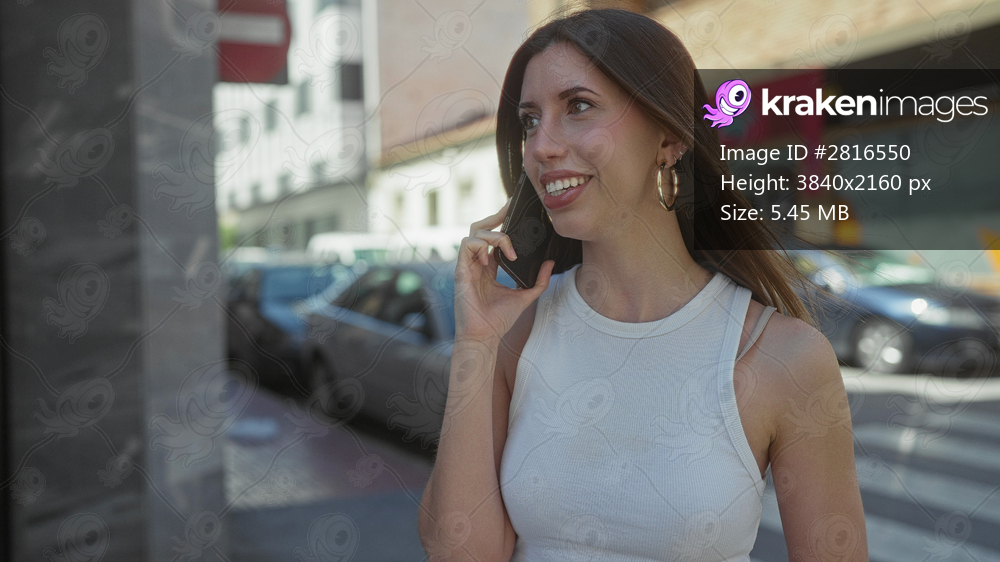 Young hispanic woman in white sleeveless top holding smartphone to ear talking on lively city street; joy.