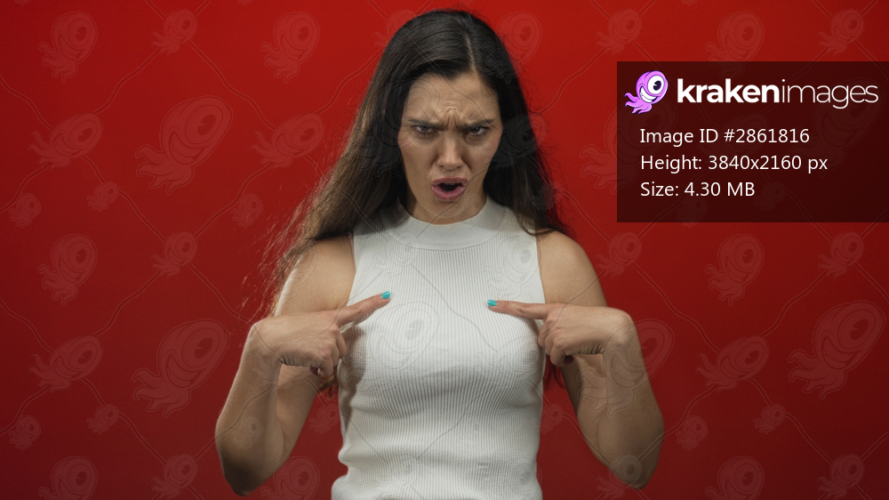 Young hispanic woman in white sleeveless top points both index fingers to chest in studio with red backdrop, furrowed brow and open mouth; skepticism.