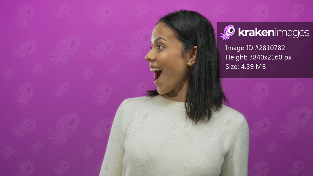 Young hispanic woman in white sweater stands against isolated pink background, expressing surprise with an open mouth and looking to the side with curiosity. - Kraken Images