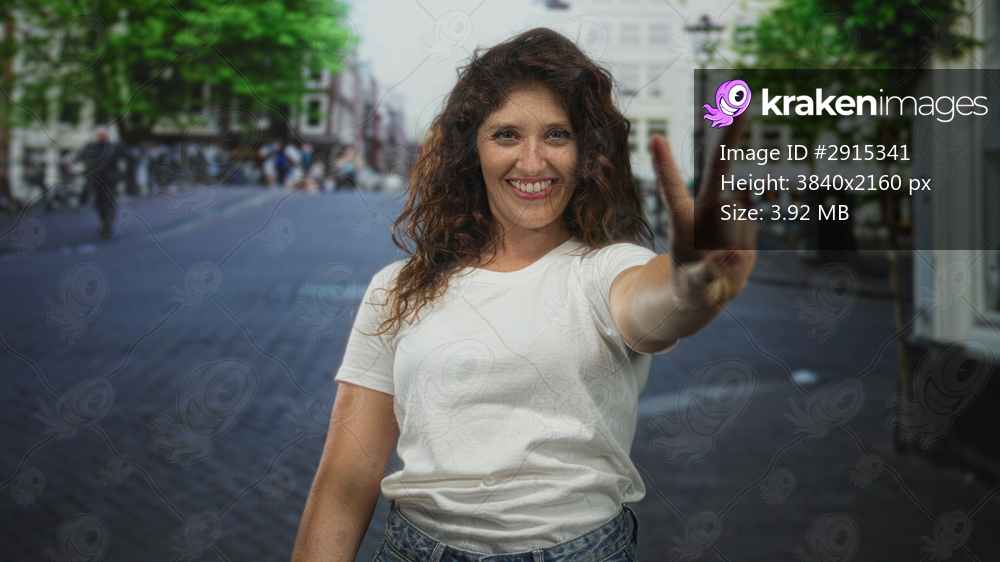 Young hispanic woman in white t shirt and denim jeans smiling with right hand showing peace sign on cobblestone street; playful friendly greeting joy.
