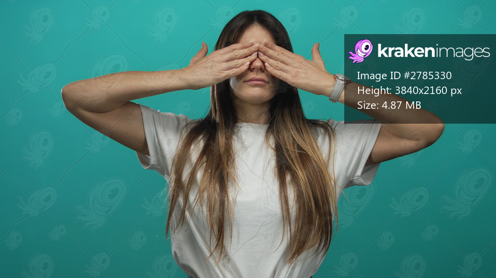 Young hispanic woman in white t-shirt expresses surprise against isolated green wall, covering eyes with hands, then revealing emotion.