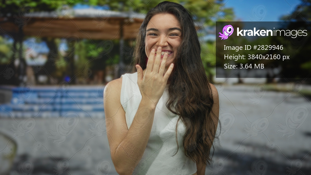 Young hispanic woman in white tank top yawning with hand covering mouth in sunny green park setting; surprise.