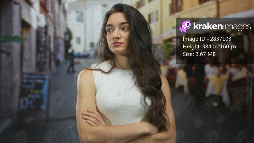 Young hispanic woman in white top with crossed arms on sunlit cobbled street at cafe terrace; rejection.
