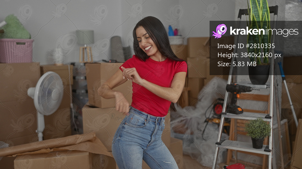 Young hispanic woman joyfully dancing in her new apartment surrounded by cardboard boxes and home items, celebrating moving into a fresh living space.