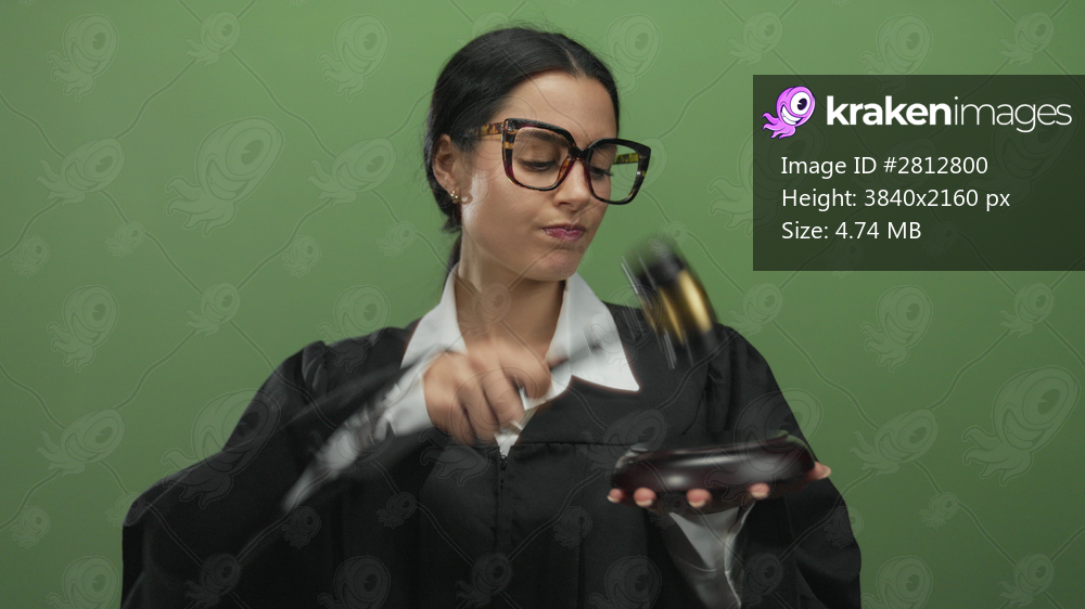 Young hispanic woman judge holding gavel against isolated green background wearing black robe and glasses depicting legal authority and justice.