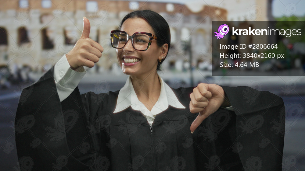 Young hispanic woman judge showing thumbs up and down in legal uniform with roman coliseum background, blending modern law and ancient rome city ambiance outdoors. - Kraken Images