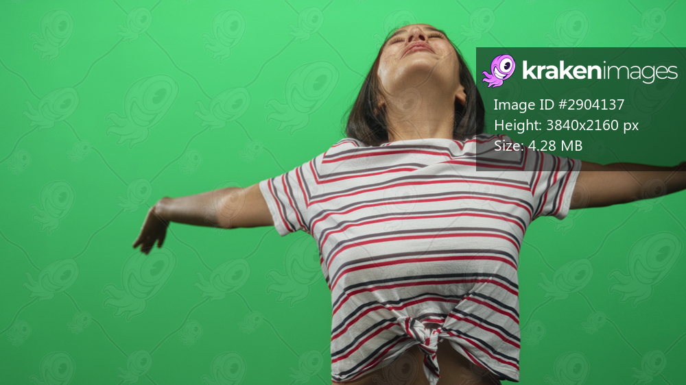 Young hispanic woman laughing with arms outstretched, knotted red white striped shirt and exposed midriff in green studio; joy freedom energy.