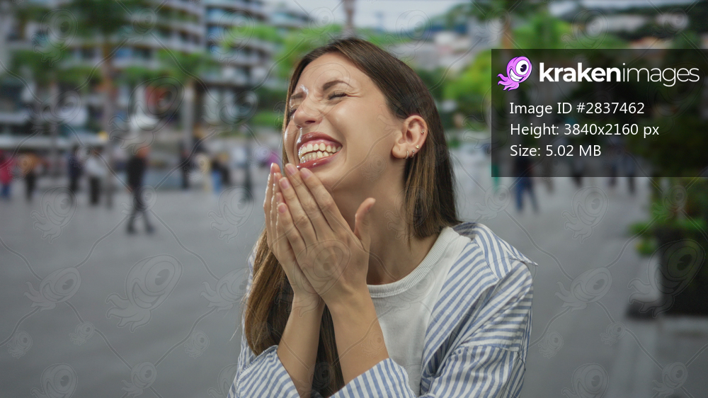 Young hispanic woman laughing and covering mouth with hands on busy outdoor city street in daylight; joy.