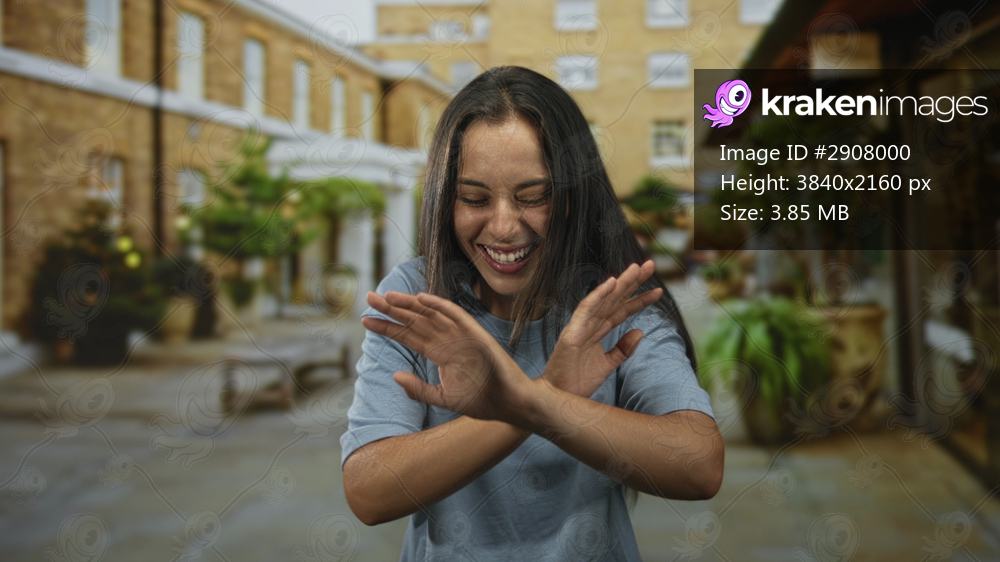 Young hispanic woman laughing with hands crossed over chest in a city street courtyard during daytime; joy celebration.