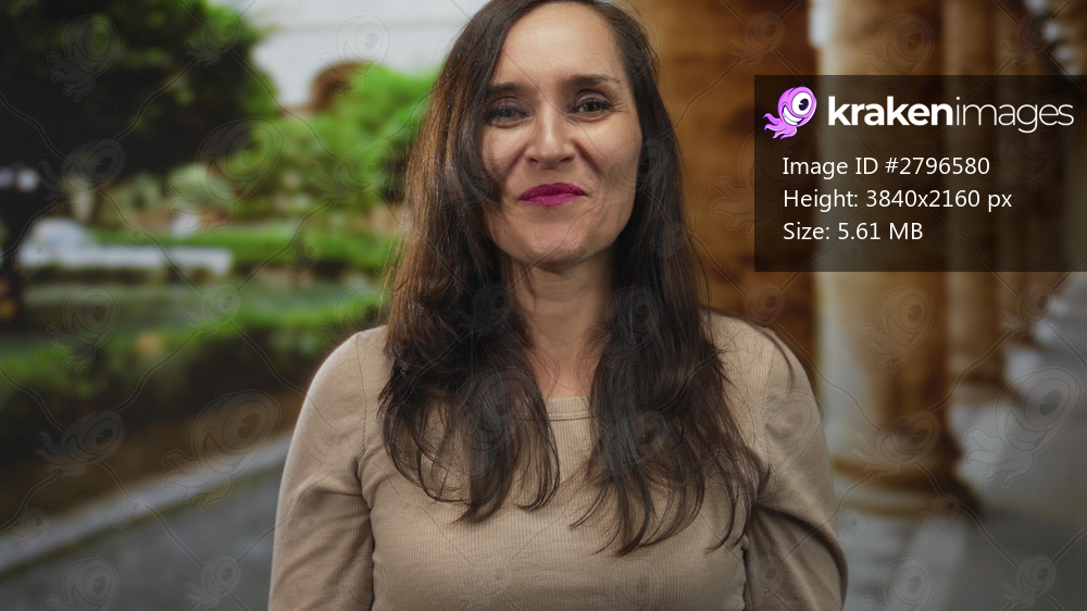 Young hispanic woman laughing joyfully on an old town street with columns in the background.