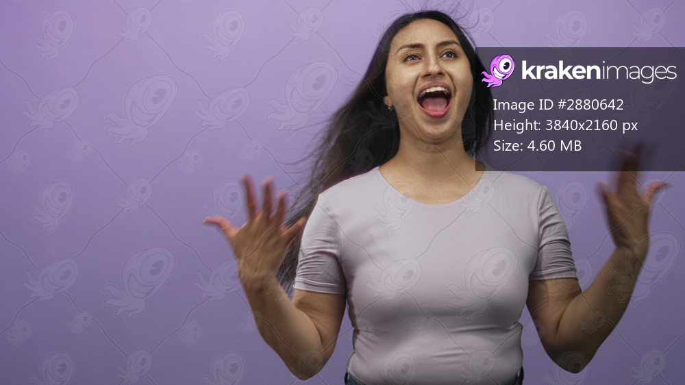 Young hispanic woman laughing with open mouth and hands raised, hair blown and lilac top visible in purple studio; joy celebration energy.