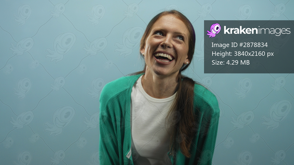 Young hispanic woman laughing with open mouth and tilted head in studio teal blue backdrop wearing green cardigan and white t shirt; joy.